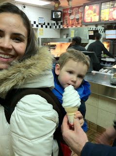 winter fall! We had tickets to see the 9/11 memorial and weren't sure how easy it would be to reschedule, so we trucked two small children through the sleet, rain, and snow to the southern tip of the island only to discover that it was closed that day - AHHH! Very frustrating! But the did get to join us in awarding Austin an ice cream cone from "Old McDonald Had a Farm" (as Austin calls it) for doing awesome on the potty. He only had two accidents in over a week. Sunday we went to church and then Super Sundays where we do a sports/food ministry to kids in Harlem. Monday we got to go to the Central Park Zoo. It was a beautiful day. We also spent a little time in Central Park. Tuesday we shared breakfast with one of their friends that lives in NY and then went to the park. Today we went back to the same park as dad wanted to capture video of Austin's bold climbing skills! We finished our time together having a picnic lunch on campus with Aaron. It was fun to do this with my parents because the boys and I do this very regularly!
